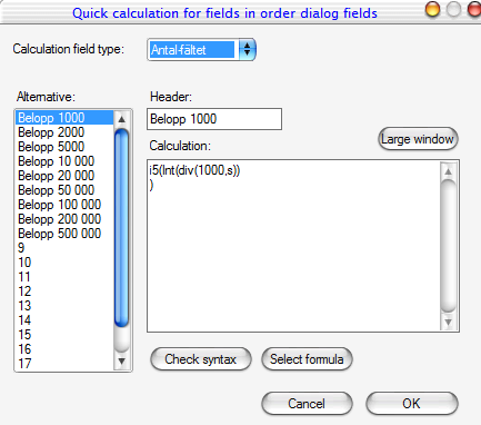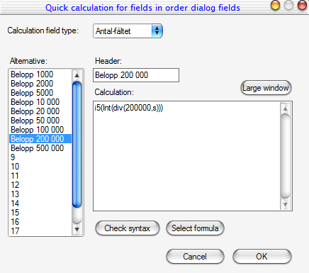 For example, define an option to buy for 200 000 SEK in manual orders, first click on the alternative that the quick field applies, Amount in this case. Then, an appropriate title for quick field, for example, 200 000 SEK. Fill out the script code that calculates how many shares SEK 200 000 is equivalent to:
