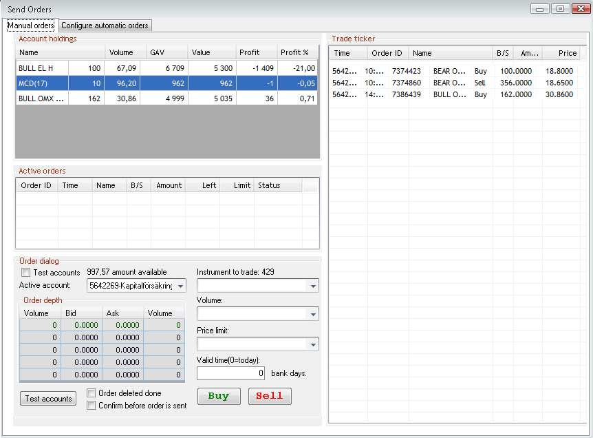 In the order dialog, you can view your holdings for each account that is selected via the drop-menu. Active orders and the days trades are visible too. For example, buying a stock, select instrument to trade, quantity, price, and which account the order shall apply to. When you click on Buy the order is sent to Nordnet and you can follow it in the Active orders list and the trade once closed in the Trade ticker list.