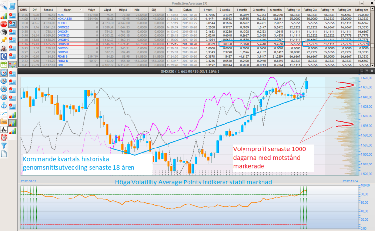 Under fredan den gångna veckan bröts motståndet runt 1650 med buller och bång, något vi väntat på mot bakgrund av våra indikatorer som länge indikerat stigande börs och hög stabilitet med tanke på den mycket låga volatiliteten i marknaden just nu. Ofta ser vi hur ett viktigt motstånd forceras med relativt stora dagsrörelser. Det kan förklaras med att ett stort antal stoplosser ligger "på andra sidan" av motståndet, och när kursen väl når dessa nivåer löser stopparna ut och i det här fallet stängdes stora mängder blankade OMX-kontrakt. Det ökar i sig köptrycket ännu mer och vi får starkt stigande kurser samma dag.