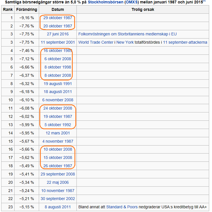 Nedan ser vi en sammanställning som vi skrev om i Efterbörsen i oktober 2016. Det framgår tydligt att den övervägande delen av dagar med minst 5% nedgång har inträffat i just oktober de senaste åren. Varför kan vi bara spekulera i. Det som inte framgår är att vid dessa tillfällen har kursen också återhämtats relativt snabbt. Generellt har det varit väldigt bra köplägen på kort sikt. En längre tids börsnedgång är något helt annat och har i praktiken alltid föregåtts av ökad volatilitet. Det är denna vi letar efter, och innan vi kan konstatera en fallande V.A.P-poäng hos ett flertal index ser vi ingen omedelbar fara för att trenden vänder nedåt. I sociala media ser vi nu ett allt större antal "olyckskorpar" som skriver om snar börsnedgång. Visst kan man aldrig utesluta ett sådant scenario, men vår analys signalerar tydligt fortsatt uppgång i närtid.