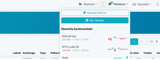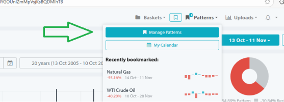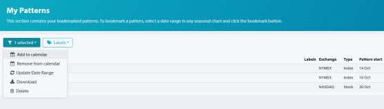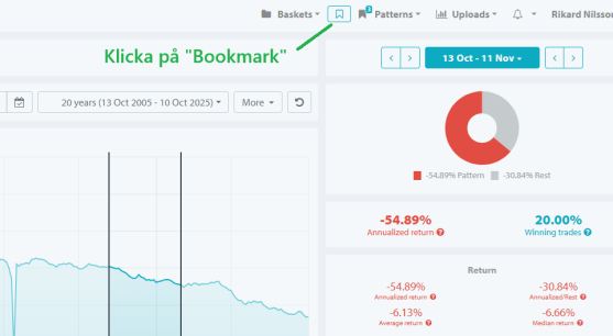 Vi hittar en "pattern" i Seasonax som vi vill lägga in i kalendern. Klicka på "Bookmark" så läggs den in i listan över favoritmarkerade "patterns". När du går till "Patterns" nästa gång ligger denna med i listan. |