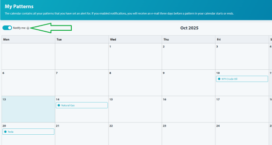 Inne i kalender kan "Notify me" väljas för att skapa larm via email 3 dagar i förväg för varje inlagd "pattern". |