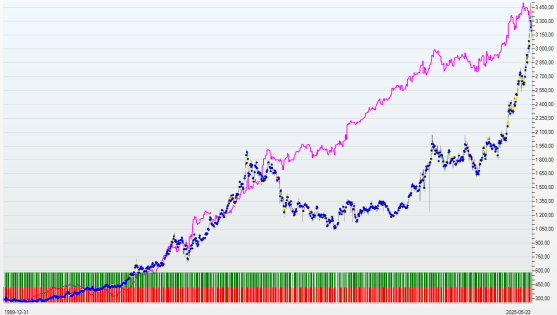 Typ av edge: Kalender/price action Tid i marknad: 13,5% Antal vinster/förluster: 481/346 Genomsnittsvinst/trade: +0,15% CAGR år 2000 - maj 2025: 5,37% CAGR riskjusterat: 39,8% |